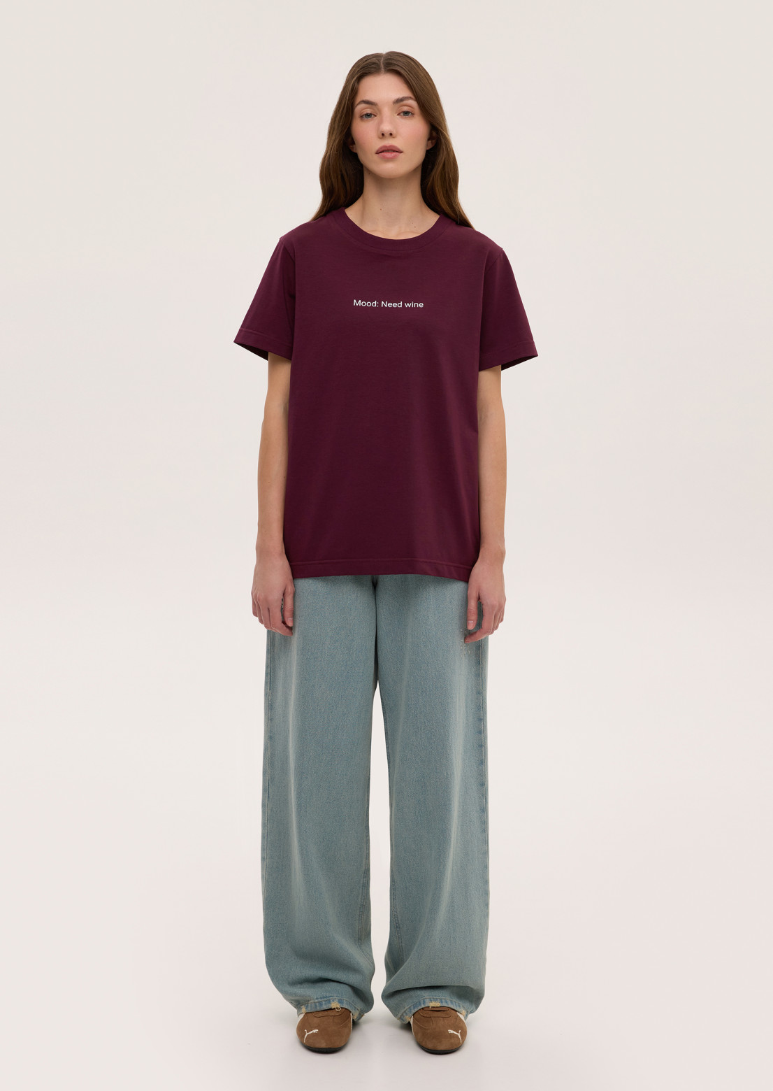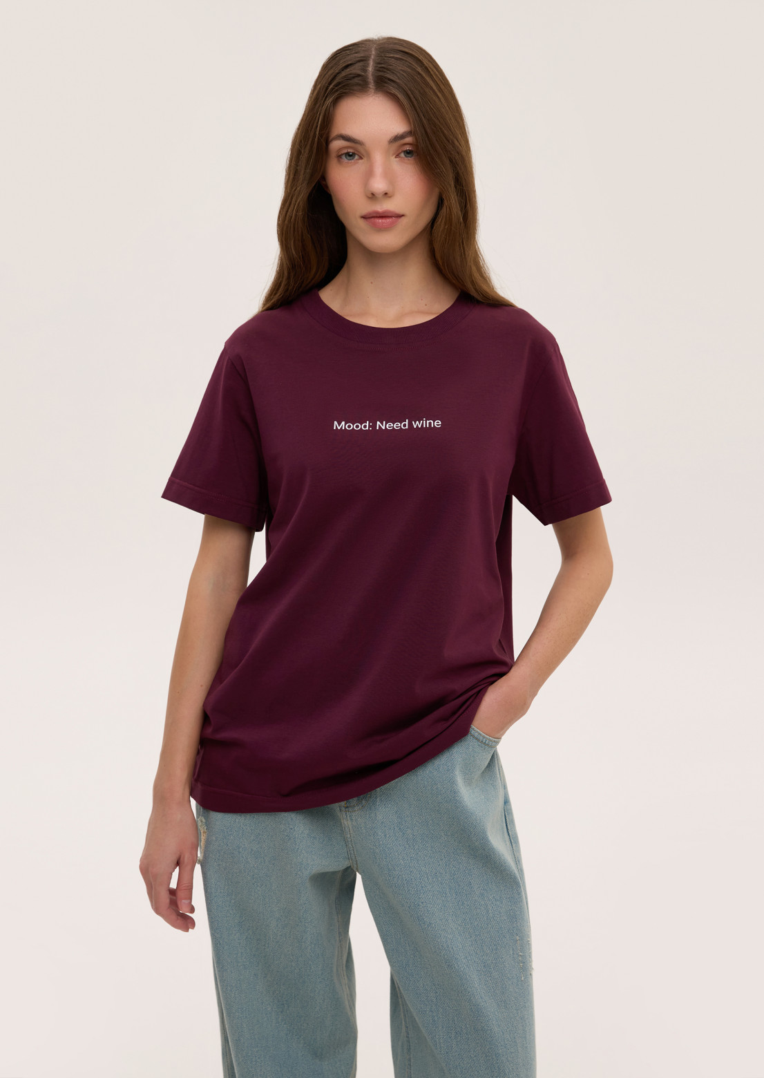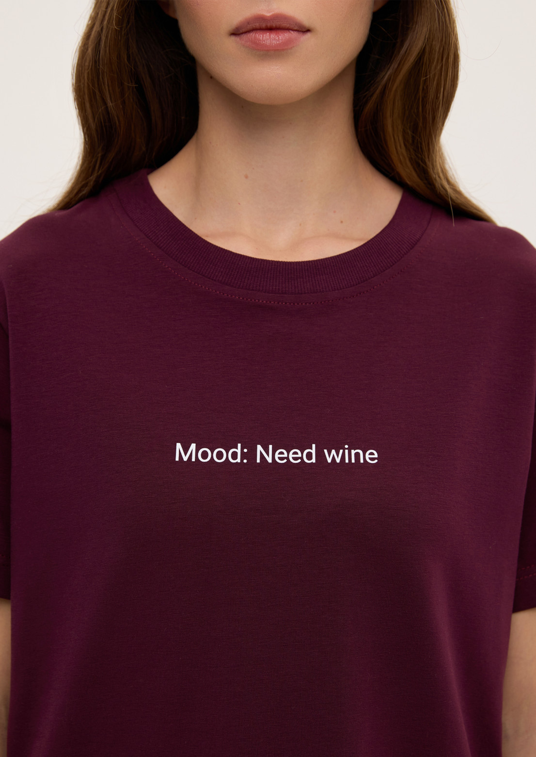 Women's marsala color t-shirt with print "Mood: Need wine" by CABANCHI